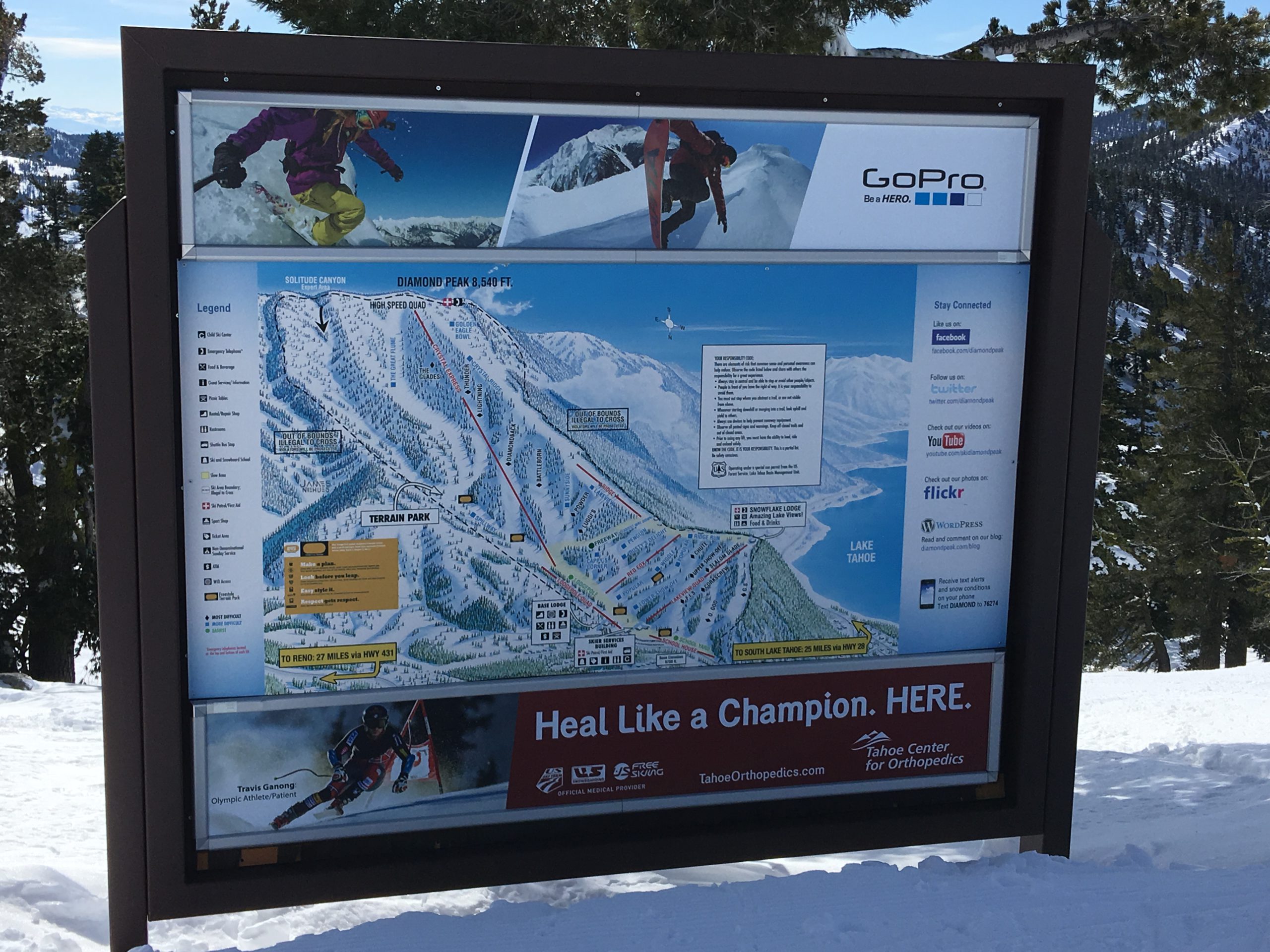 今冬は積雪が例年より多く、リノ・タホ―周辺のスキー場はどこもここ数年来久々の抜群のゲレンデ・コンディション。お天気と気温がマイルドな日を選び Diamond Peak Ski Resort へ。リノからMt.Rose Hwyのシーニック・ドライブを経てタホ湖もチラ見しながらスキー場へ。結構な降雪があった日から5日を経ていて道路はチェーン規制もなくクリアで安心ドライブ。リノ市内から小一時間もかからないでした。